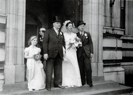 group at Morris Segal's wedding. On the back: "Morris Esther Ann & Mark. 19/5/44". Note difference of date from morriswdg01.